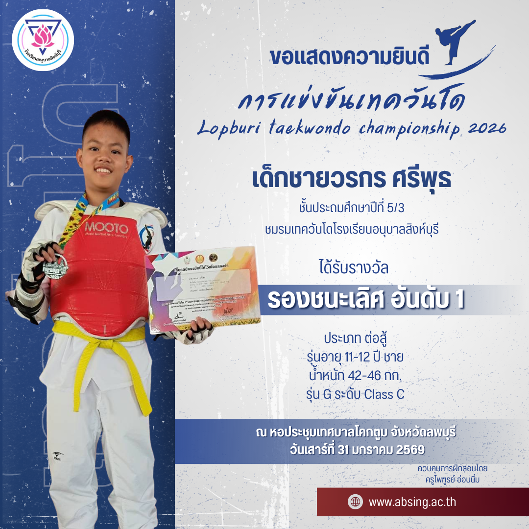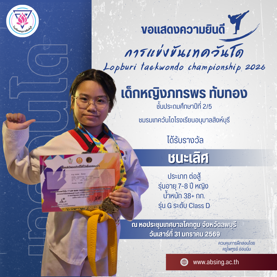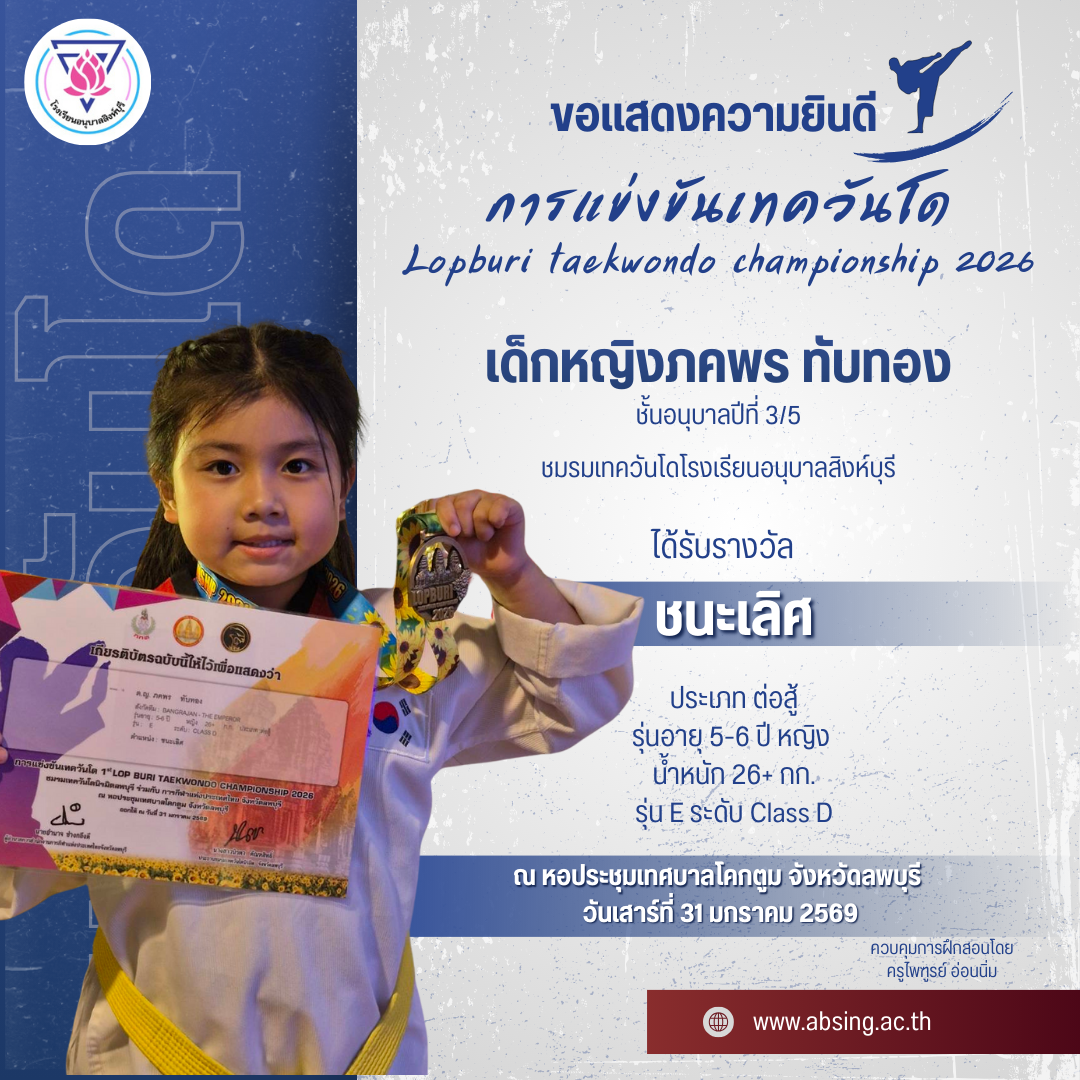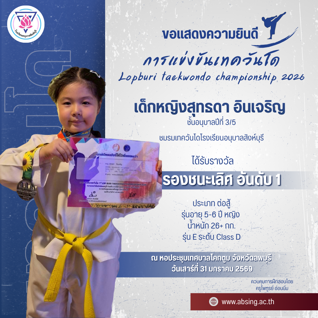 โรงเรียนอนุบาลสิงห์บุรี ขอแสดงความยินดีกับนักกีฬาเทควันโด รายการแข่งขันเทควันโด Lopburi taekwondo championship 2026 ณ หอประชุมเทศบาลโคกตูม จังหวัดลพบุรี 5 มี.ค. 2569admin_Fahรางวัลแห่งความภาคภูมิใจ (นักเรียน)