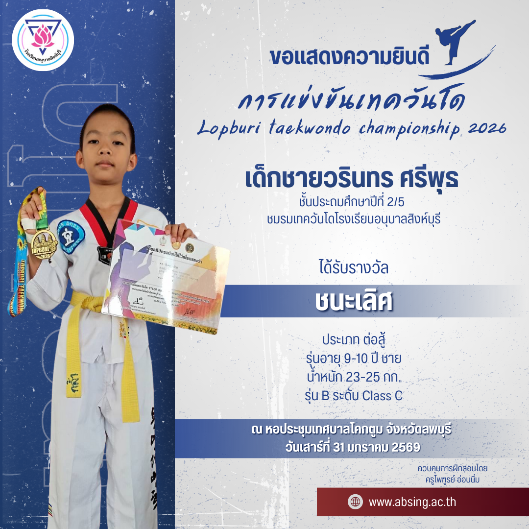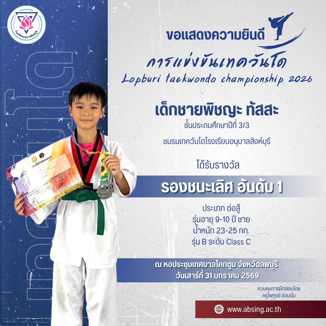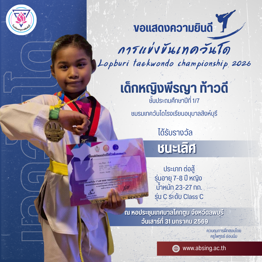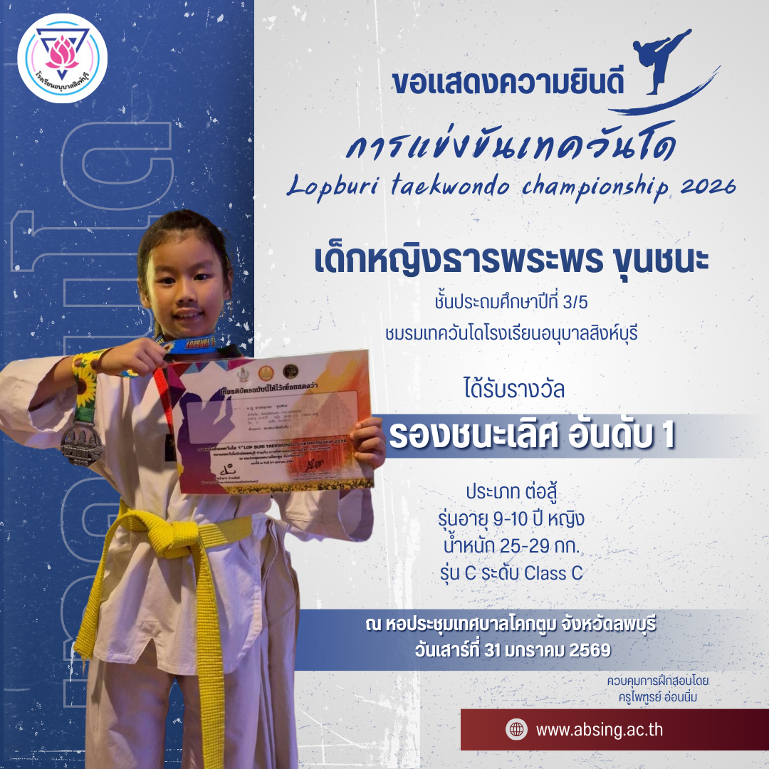 โรงเรียนอนุบาลสิงห์บุรี ขอแสดงความยินดีกับนักกีฬาเทควันโด รายการแข่งขันเทควันโด Lopburi taekwondo championship 2026 ณ หอประชุมเทศบาลโคกตูม จังหวัดลพบุรี 5 มี.ค. 2569admin_Fahรางวัลแห่งความภาคภูมิใจ (นักเรียน)