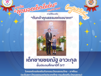 โรงเรียนอนุบาลสิงห์บุรี ขอแสดงความยินดีกับ เด็กชายชยณัฐ อาวะกุล ในโอกาสได้รับรางวัล “สุดยอดเด็กดีเด่น” ประจำปี พ.ศ. 2569 ภายใต้แนวคิด “ต้นกล้าคุณธรรมแห่งอนาคต”