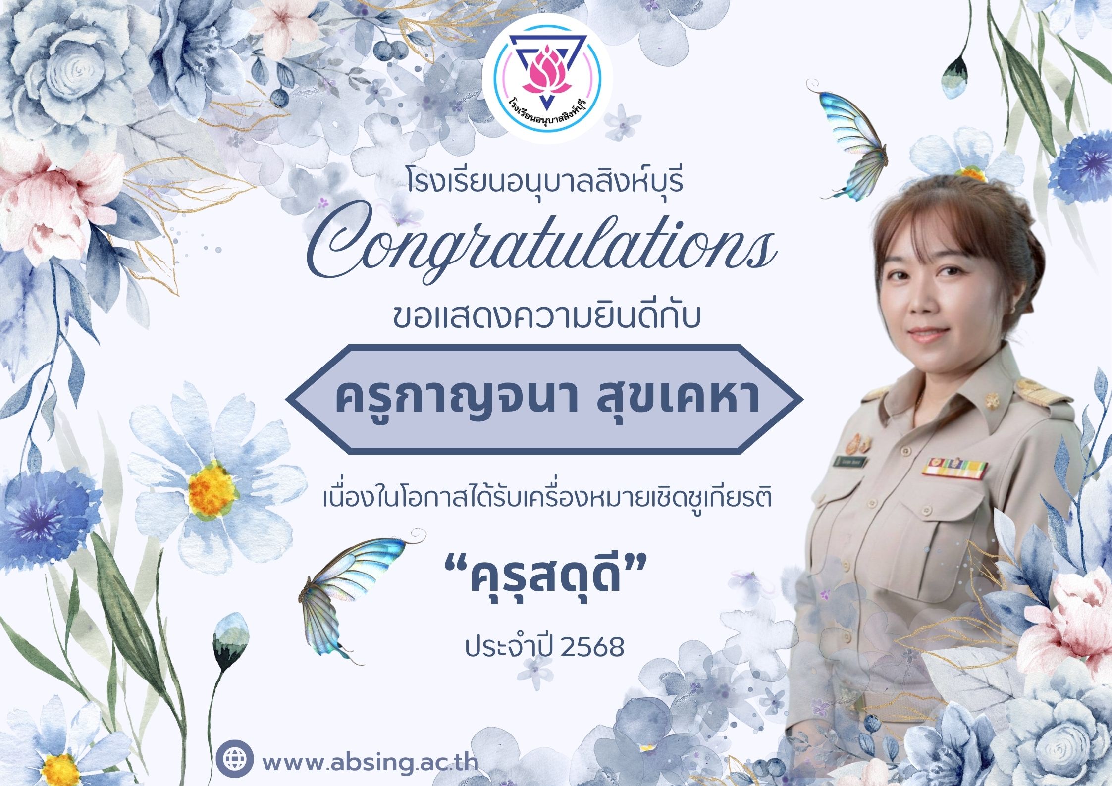 โรงเรียนอนุบาลสิงห์บุรี ขอแสดงความยินดีคุณครูกาญจนา สุขเคหา ได้รับเครื่องหมายเชิดชูเกียรติ “คุรุสดุดี” ประจำปี 2568 14 ต.ค. 2568admin_Fahรางวัลแห่งความภาคภูมิใจ (ครู)