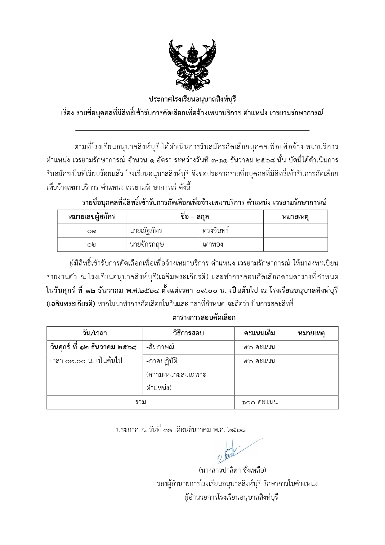 ประกาศโรงเรียนอนุบาลสิงห์บุรี เรื่อง รายชื่อบุคคลที่มีสิทธิเข้ารับการคัดเลือกเพื่อจ้างเหมาบริการ ตำแหน่ง เวรยามรักษาการณ์ 11 ธ.ค. 2568schoolประกาศ