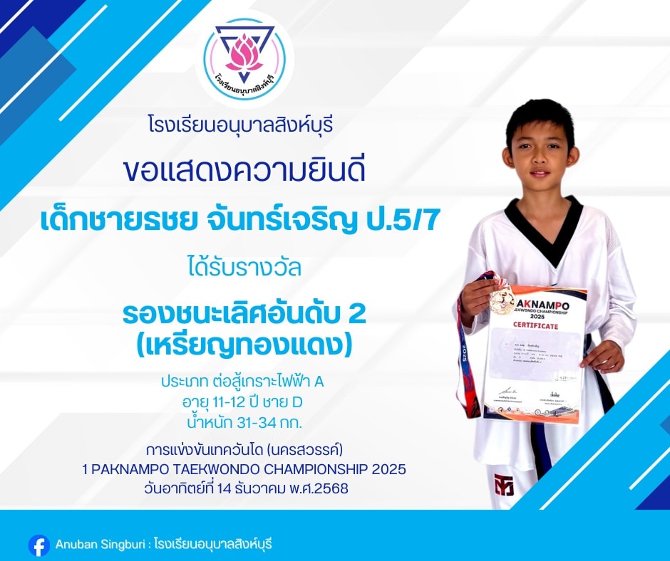 โรงเรียนอนุบาลสิงห์บุรี ขอแสดงความยินดีกับ เด็กชายธชย จันทร์เจริญ ได้รับรางวัลรองชนะเลิศอันดับ 2 (เหรียญทองแดง) การแข่งขันเทควันโด (นครสวรรค์) 1st PAKNAMPO TAEKWONDO CHAMPIONSHIP 2025 27 ธ.ค. 2568admin_Fahรางวัลแห่งความภาคภูมิใจ (นักเรียน)