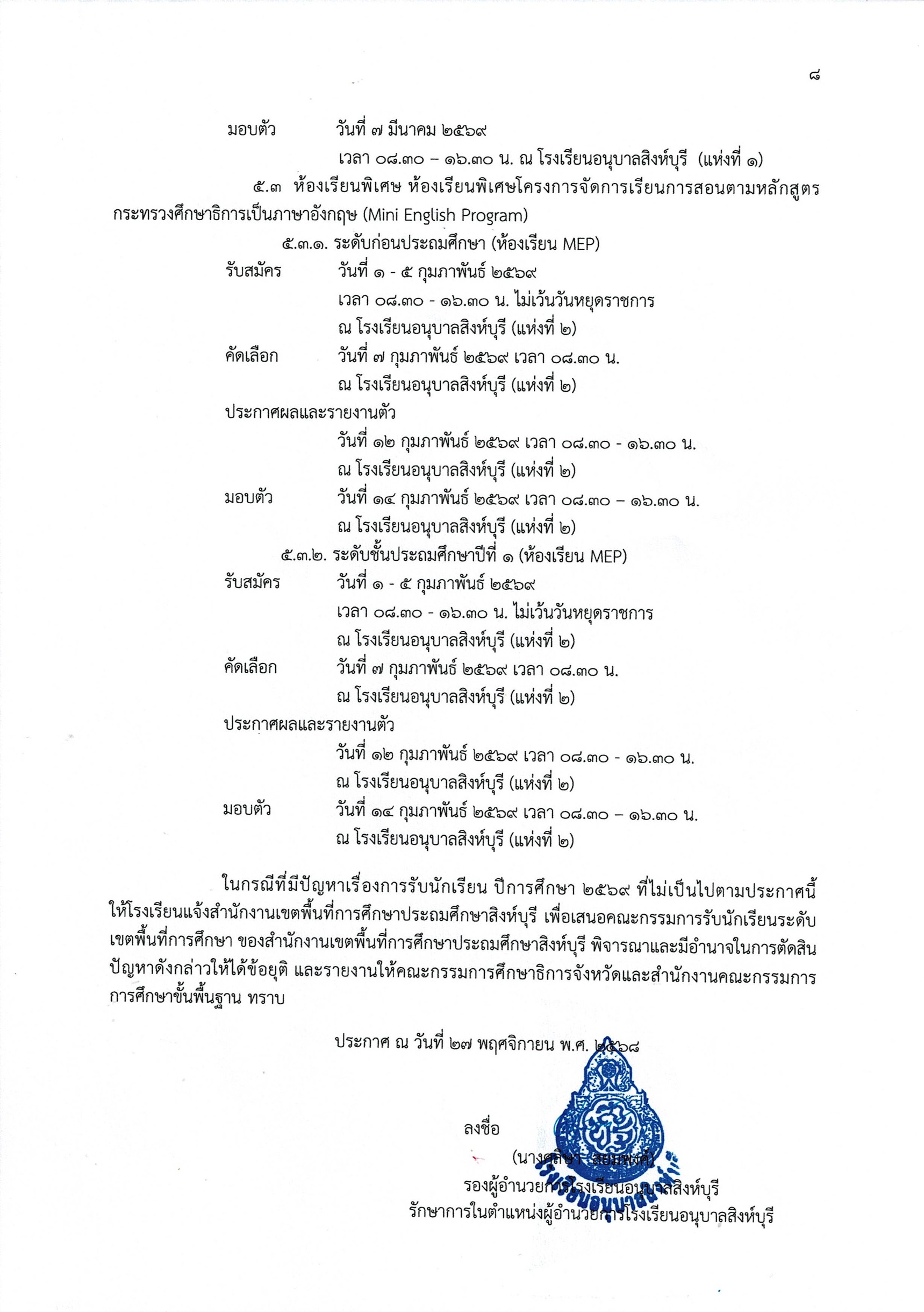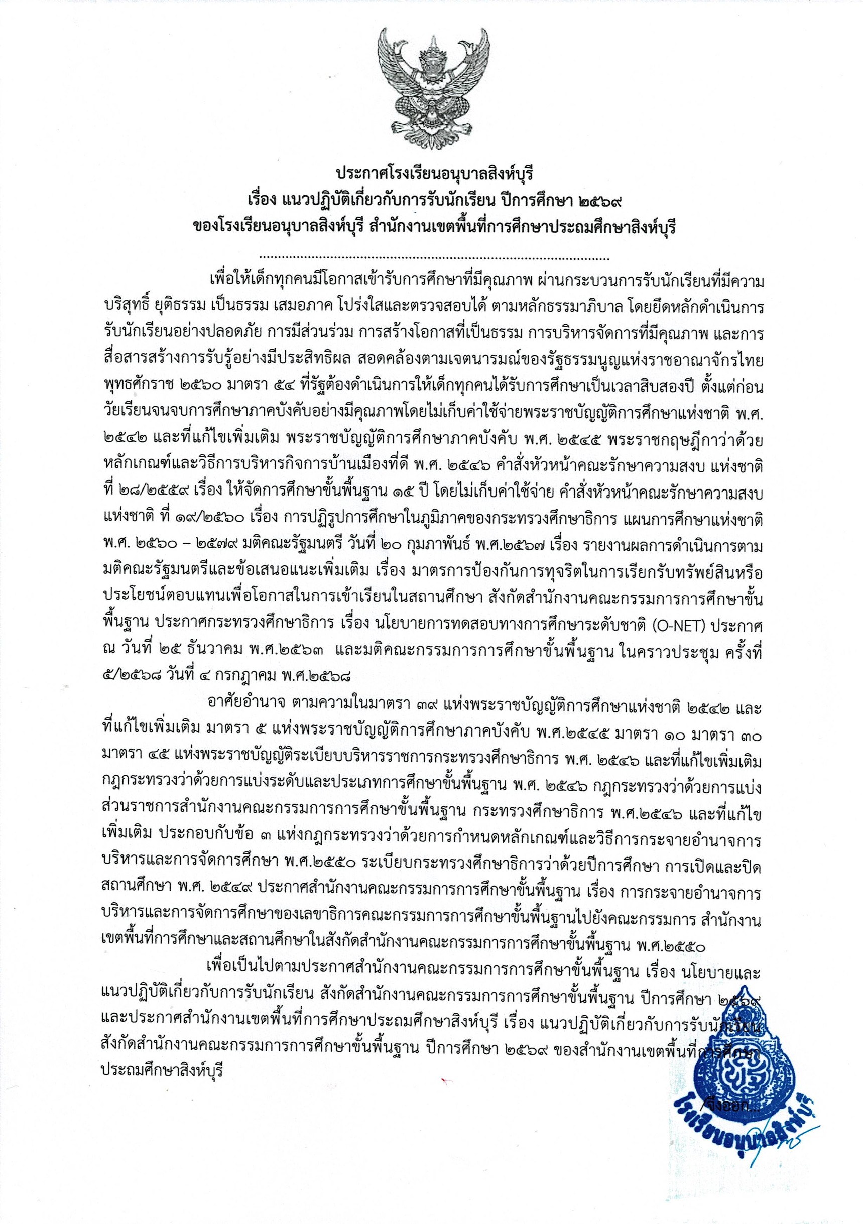 ประกาศโรงเรียนอนุบาลสิงห์บุรี เรื่องแนวปฏิบัติเกี่ยวกับการรับนักเรียน ปีการศึกษา ๒๕๖๙ 8 ม.ค. 2569admin_Fahประกาศ