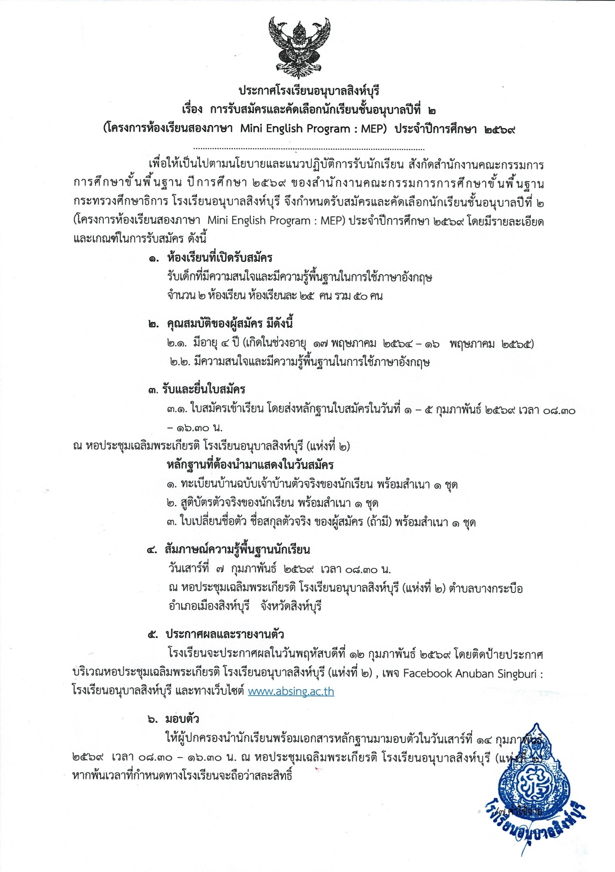 การรับสมัครและคัดเลือกนักเรียนชั้นอนุบาลปีที่ ๒ (โครงการห้องเรียนสองภาษา Mini English Program : MEP) ประจำปีการศึกษา ๒๕๖๙ 8 ม.ค. 2569admin_Fahประกาศ