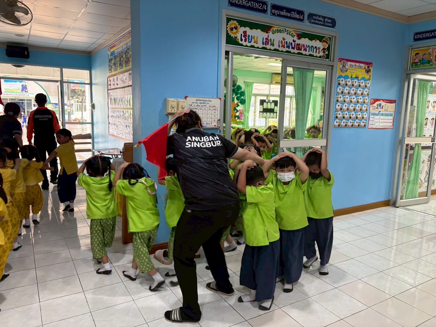 โรงเรียนอนุบาลสิงห์บุรี สายชั้นปฐมวัย นำโดยนางศุลิษา สยมพงษ์ , นายวัชเรศ วงษ์เฉลียง และนางสาวจารุวรรณ นิ่มตลุง รองผู้อำนวยการโรงเรียนอนุบาลสิงห์บุรี คณะครูสายชั้นปฐมวัยโรงเรียนอนุบาลสิงห์บุรี จัดกิจกรรม “การซักซ้อมแผนเผชิญเหตุภัยพิบัติ (แผ่นดินไหว)” ให้กับนักเรียนชั้นอนุบาลปีที่ 2-3 ภายใต้โครงการส่งเสริมสุขภาพดีมีสุข เพื่อเป็นการฝึกปฏิบัติและจำลองสถานการณ์ ให้ทราบถึงขั้นตอนการเอาตัวรอด การช่วยเหลือ ป้องกันภัย ลดความสูญเสียหากมีการเกิดเหตุการณ์จริง กิจกรรมในครั้งนี้ได้รับความร่วมมือจาก จ่าเอกธีรภัทร์ เอี่ยมสม ตำแหน่ง นักทรัพยากรบุคคลชำนาญการ อบต.ห้วยไผ่ เป็นวิทยากร ณ โดมโรงเรียนอนุบาลสิงห์บุรี