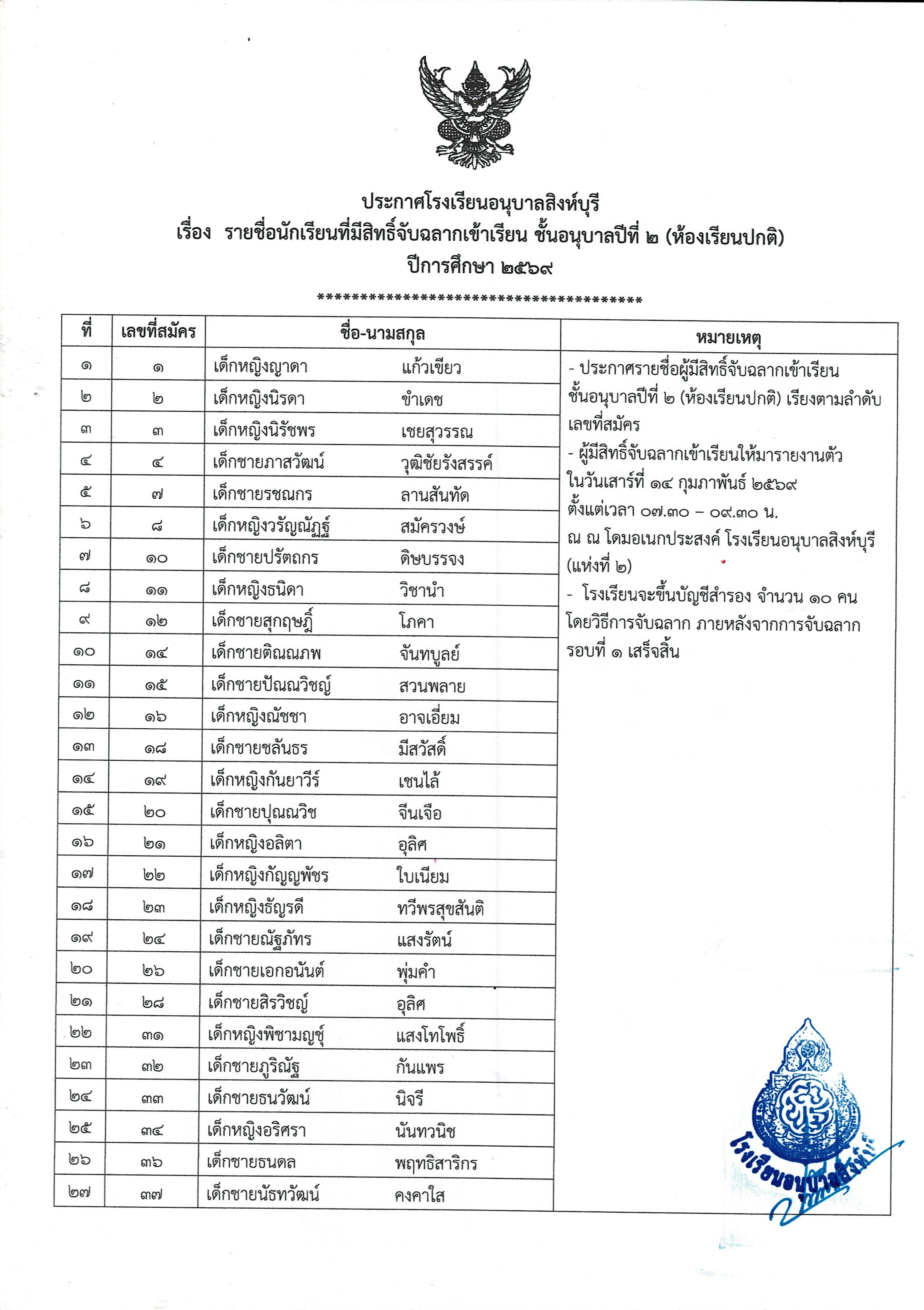 ประกาศโรงเรียนอนุบาลสิงห์บุรี เรื่อง รายชื่อนักเรียนที่มีสิทธิ์จับฉลากเข้าเรียน ชั้นอนุบาลปีที่ 2 (ห้องเรียนปกติ) ปีการศึกษา 2569 13 ก.พ. 256913 ก.พ. 2026admin_Fahประกาศ