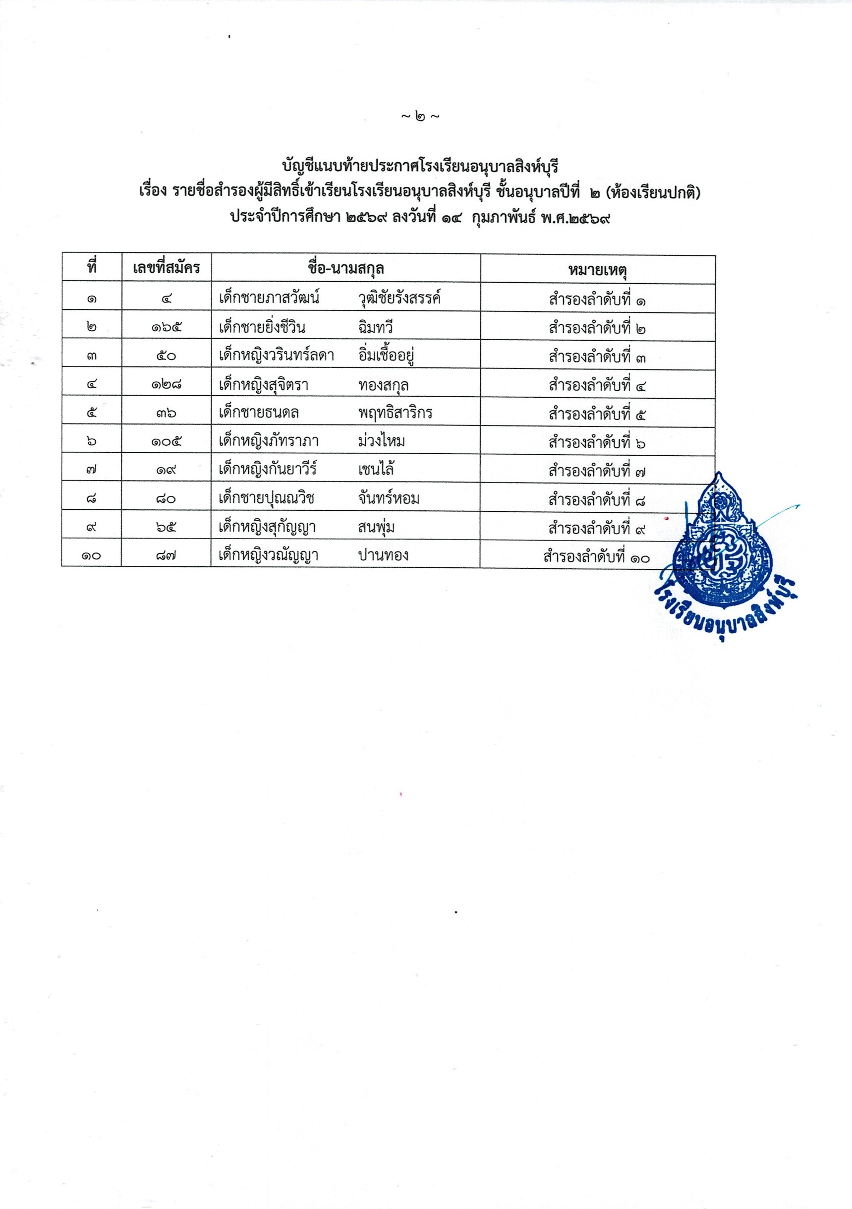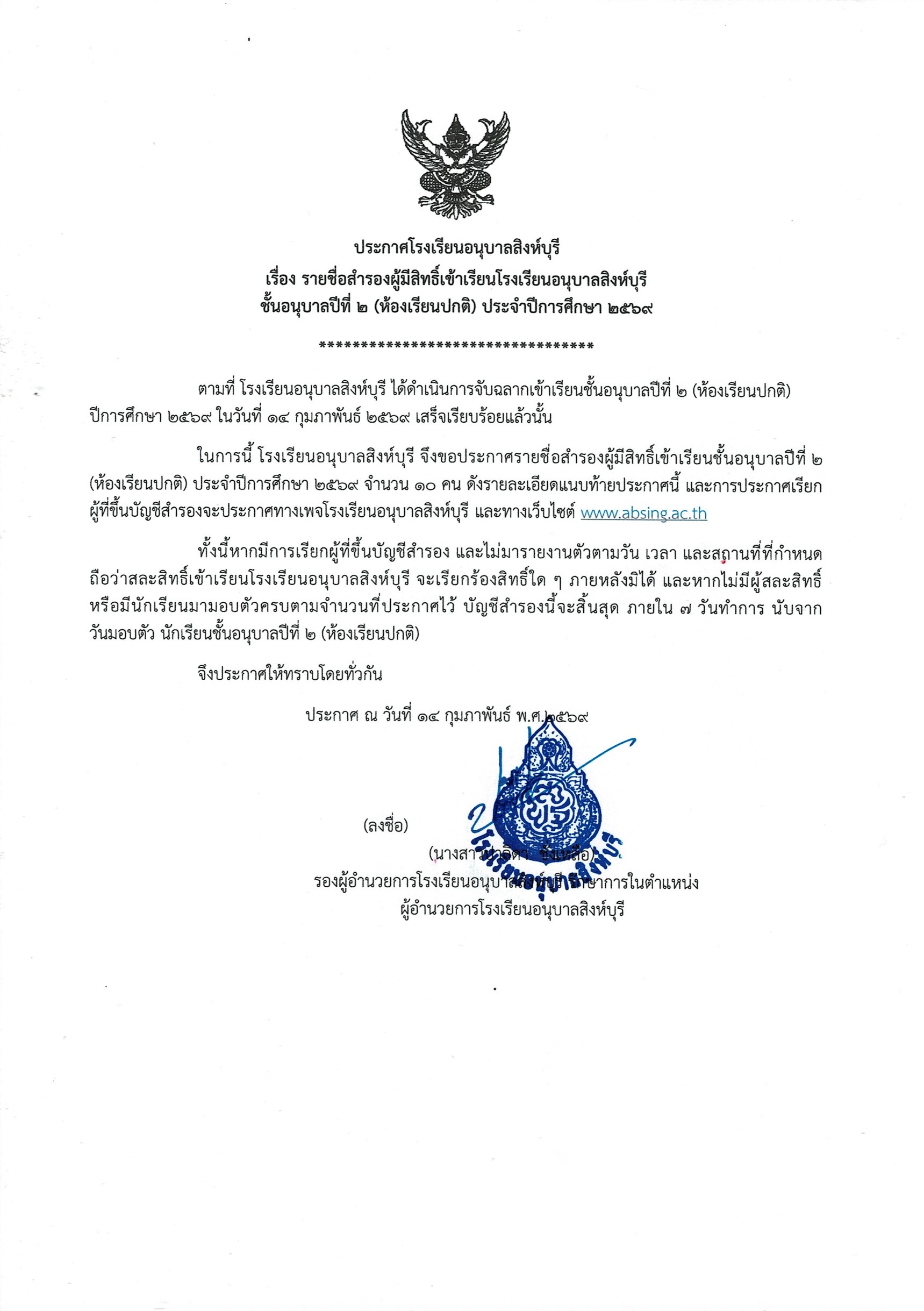 ประกาศโรงเรียนอนุบาลสิงห์บุรี เรื่อง รายชื่อสำรองผู้มีสิทธิ์เข้าเรียนโรงเรียนอนุบาลสิงห์บุรี ชั้นอนุบาลปีที่ 2 (ห้องเรียนปกติ) ประจำปีการศึกษา 2569 17 ก.พ. 2569admin_Fahประกาศ