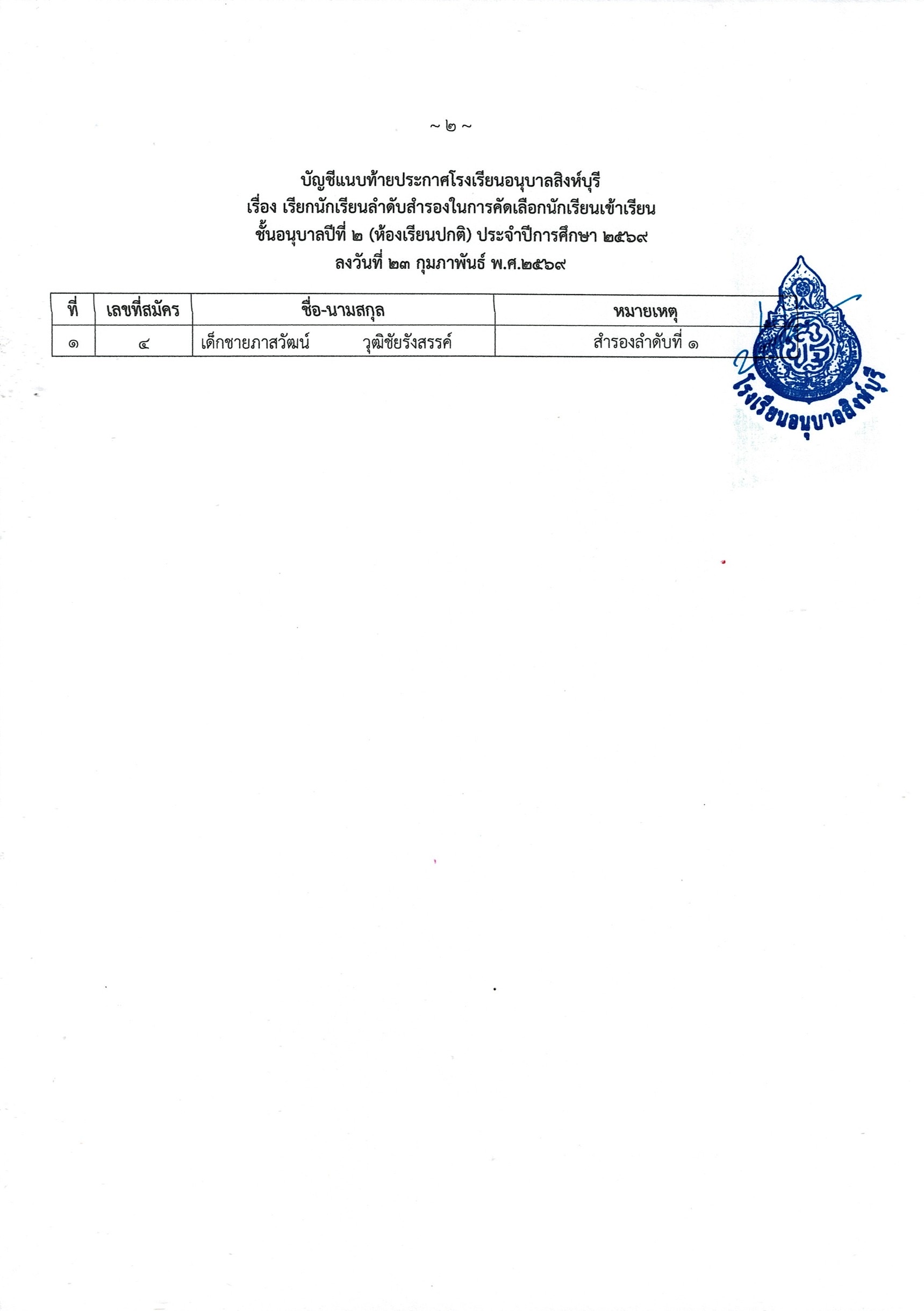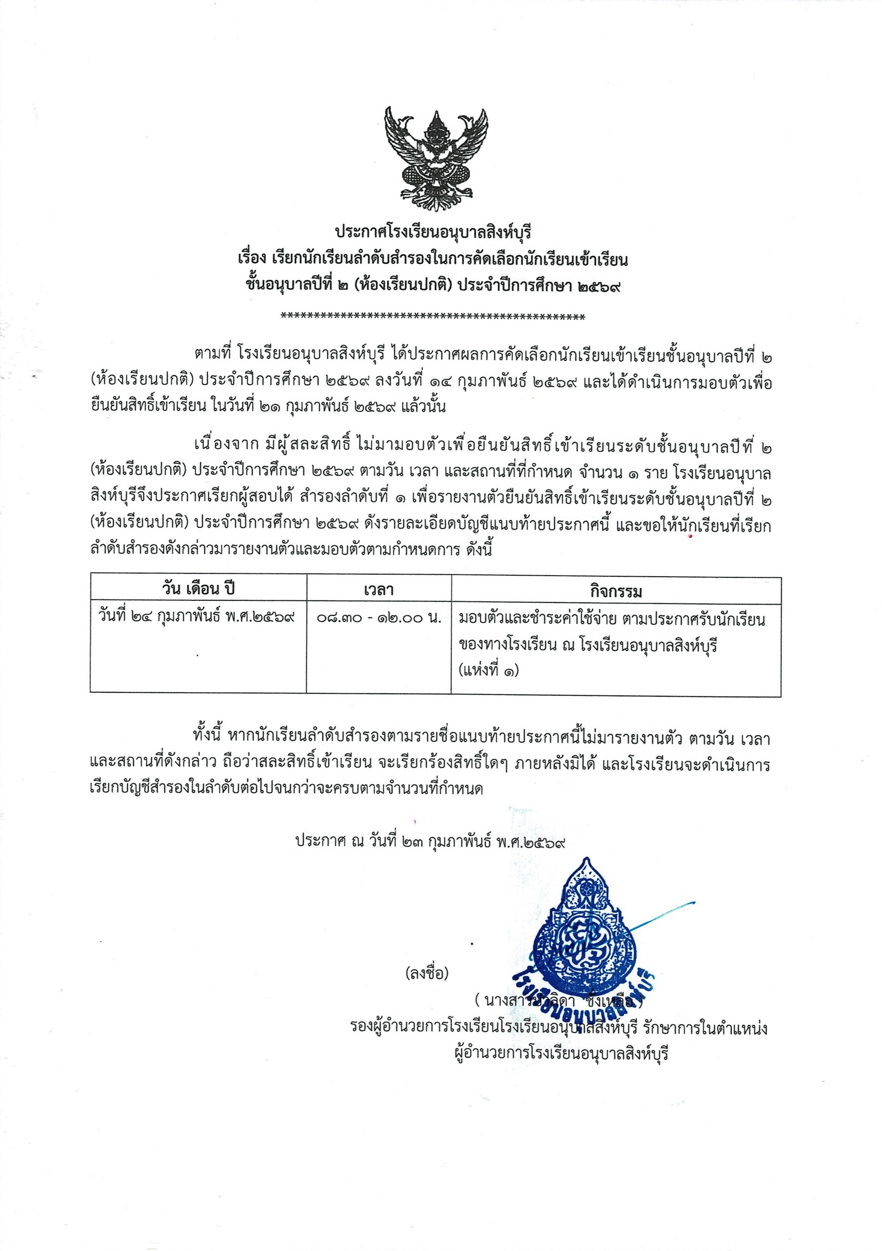 ประกาศโรงเรียนอนุบาลสิงห์บุรี เรื่อง เรียกนักเรียนลำดับสำรองในการคัดเลือกนักเรียนเข้าเรียนชั้นอนุบาลปีที่ 2 (ห้องเรียนปกติ) ประจำปีการศึกษา 2569 23 ก.พ. 2569admin_Fahประกาศ