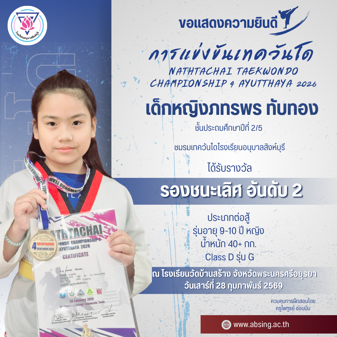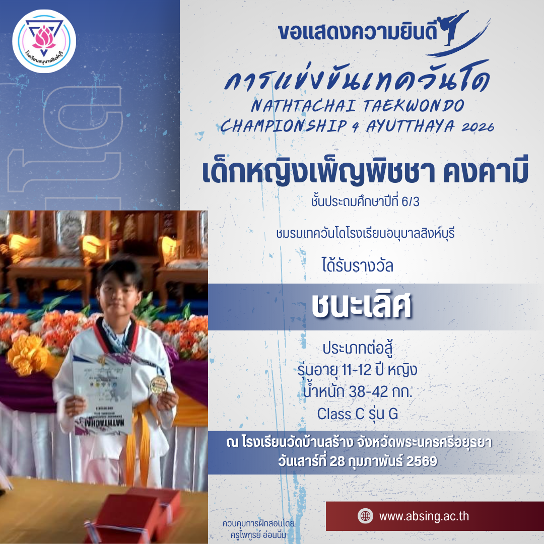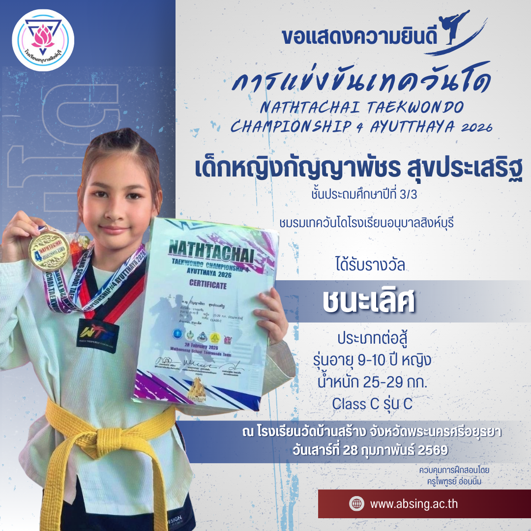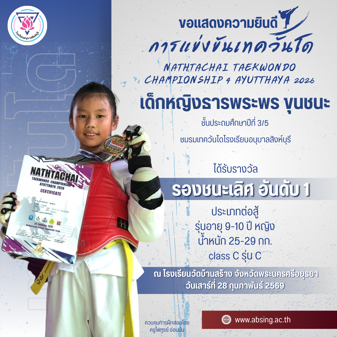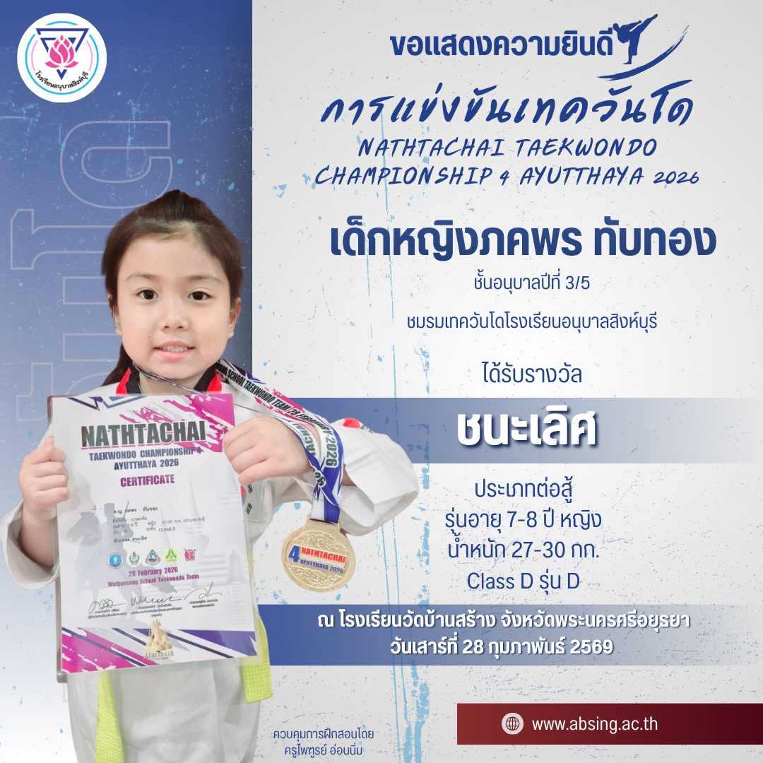 โรงเรียนอนุบาลสิงห์บุรี ขอแสดงความยินดีกับนักกีฬาเทควันโด NATHTACHAI TAEKWONDO CHAMPIONSHIP 4 AYUTTHAYA 2026 ณ โรงเรียนวัดบ้านสร้าง จังหวัดพระนครศรีอยุธยา 9 มี.ค. 2569admin_Fahรางวัลแห่งความภาคภูมิใจ (นักเรียน)