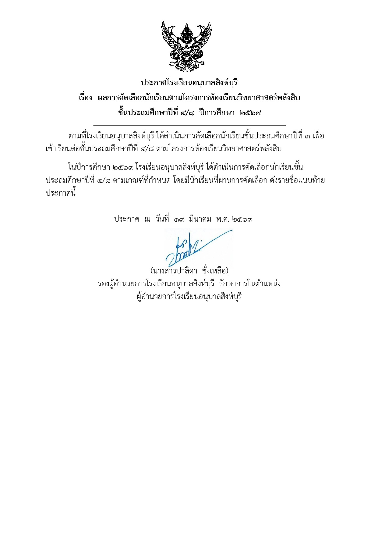 ประกาศโรงเรียนอนุบาลสิงห์บุรี เรื่อง ผลการคัดเลือกนักเรียนตามโครงการห้องเรียนวิทยาศาสตร์พลังสิบ ชั้นประถมศึกษาปีที่ 4/8 ปีการศึกษา 2569 20 มี.ค. 2569admin_Fahประกาศ