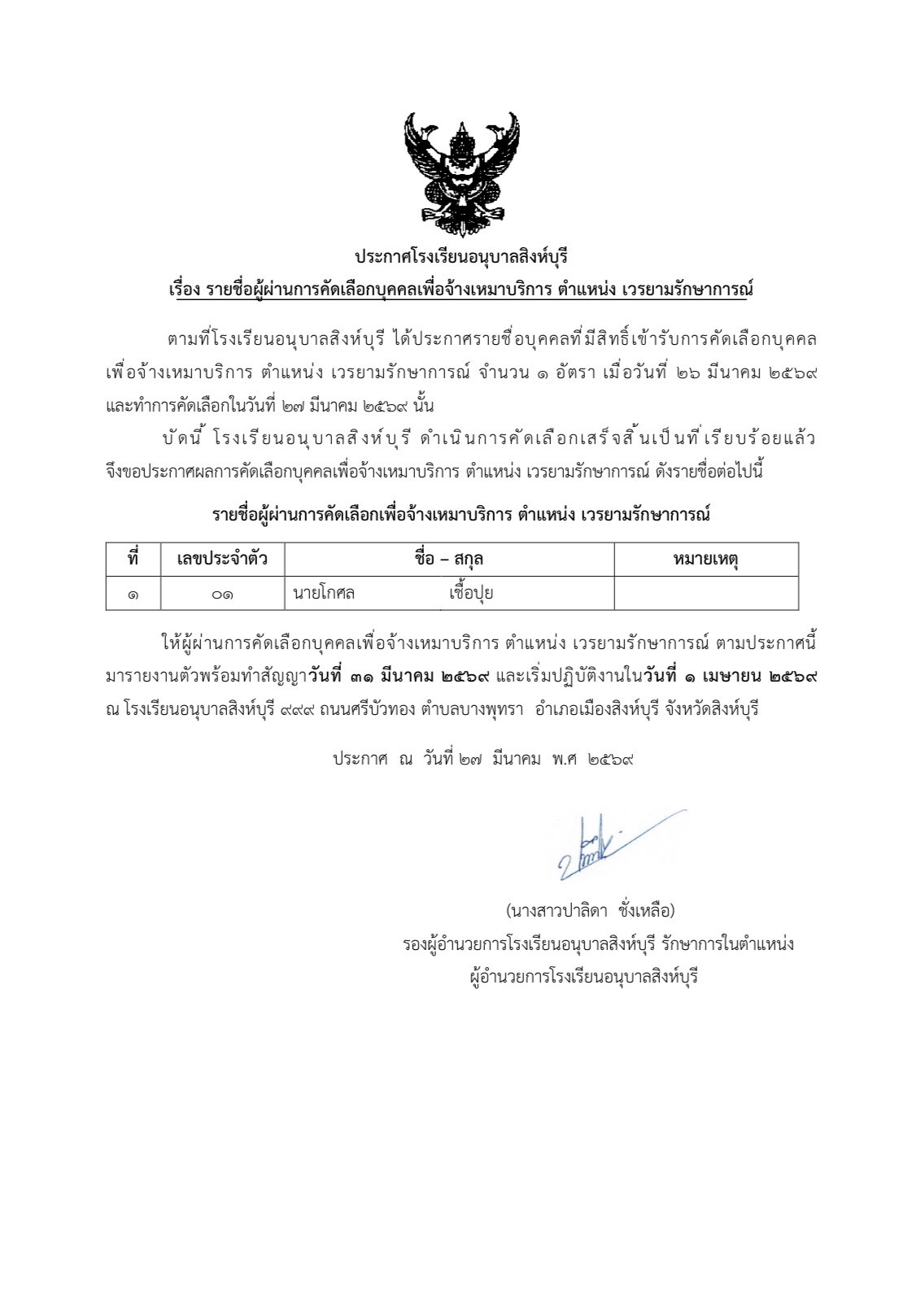 ประกาศโรงเรียนอนุบาลสิงห์บุรี เรื่อง รายชื่อผู้ผ่านการคัดเลือกบุคคลเพื่อจ้างเหมาบริการ ตำแหน่ง เวรยามรักษาการณ์ 27 มี.ค. 2569admin_Fahประกาศ