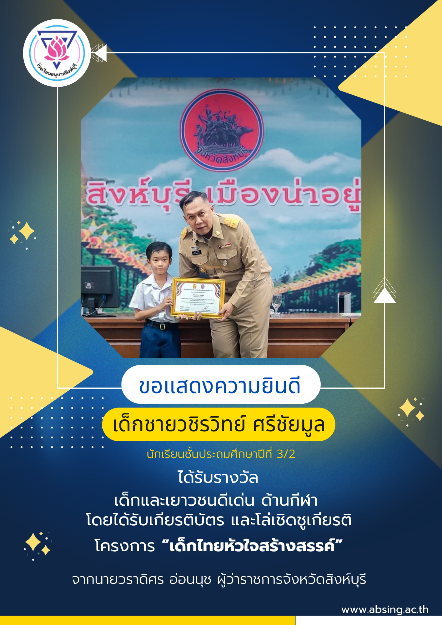 โรงเรียนอนุบาลสิงห์บุรี ขอแสดงความยินดีกับ เด็กชายวชิรวิทย์ ศรีชัยมูล นักเรียนชั้นประถมศึกษาปีที่ 3/2 ผู้ได้รับรางวัล สาขาเด็กและเยาวชนดีเด่นด้านกีฬา 28 เม.ย. 2569admin_Fahรางวัลแห่งความภาคภูมิใจ (นักเรียน)