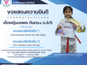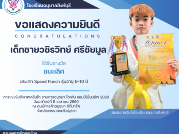 เด็กชายธชย จันทร์เจริญ นักเรียนชั้นประถมศึกษาปีที่ 5/7 ได้รับรางวัล รองชนะเลิศอันดับ 1 🥈 การแข่งขัน GH Bank เทควันโดชิงชนะเลิศแห่งประเทศไทย ประจำปี 2569